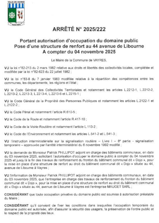 Compte tenu des travaux de renforcement du fronton du Dojo et pour la sécurité de toutes et de tous, l’accès à la Mairie côté Avenue de Libourne (portail) sera interdit aux véhicules.
