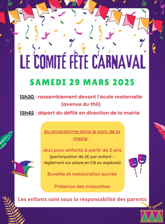 Venez célébrer le Carnaval le samedi 29 mars avec le comité des fêtes autour de Monsieur Carnaval à découvrir le jour J !